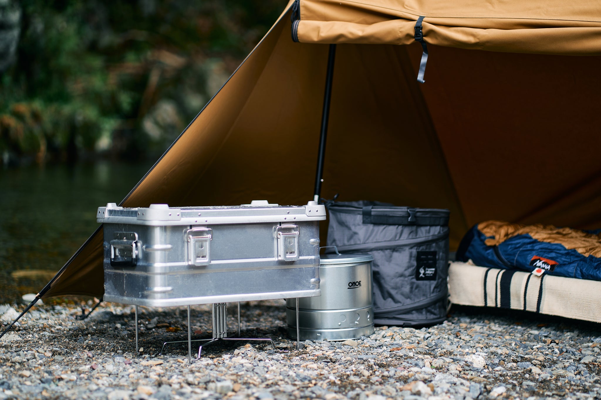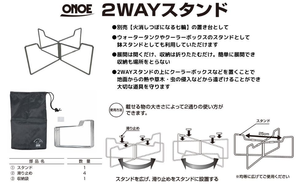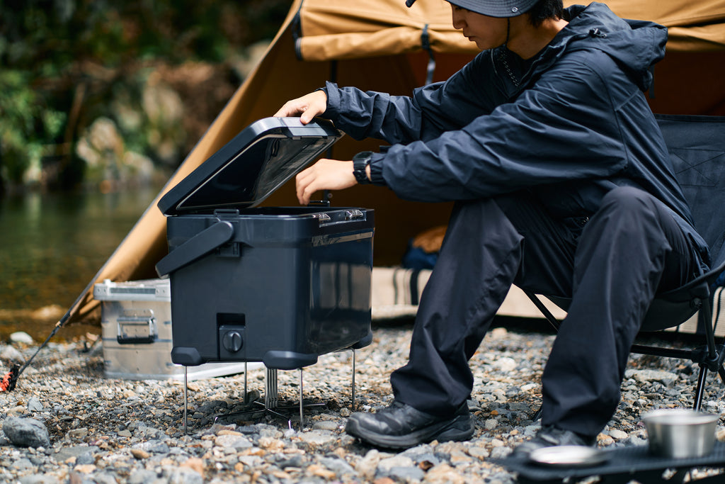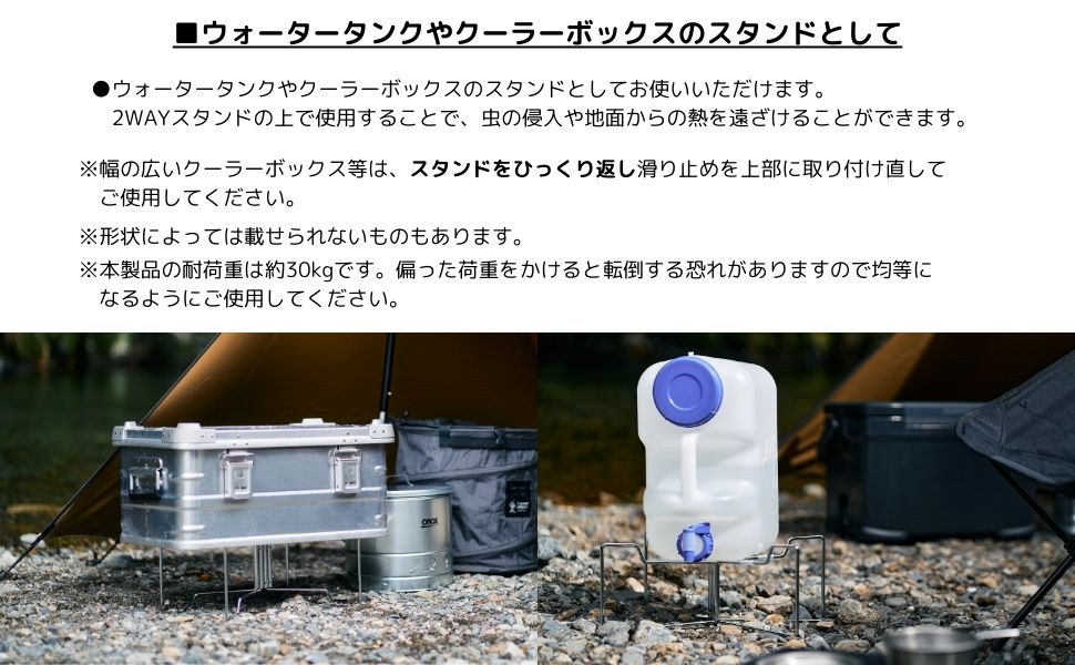 2WAYスタンドの上にクーラーボックスなどを置くことで地面からの熱や草木、虫の侵入などから遠ざけることができ、大切な道具を守ります。